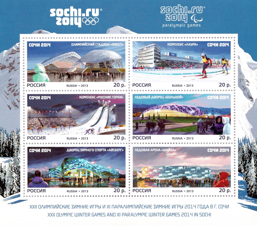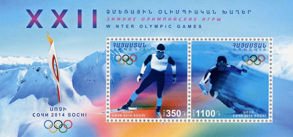 The stamps of Eastern Europe depicting the 2014 Winter Olympics of Sochi are truly an eclectic group. They range from the Russia issue of event venues in Sochi and adorable mascots to issues by Estonia and Kazakhstan of individual sports ending in the Belarus issue of the Olympic flame.
