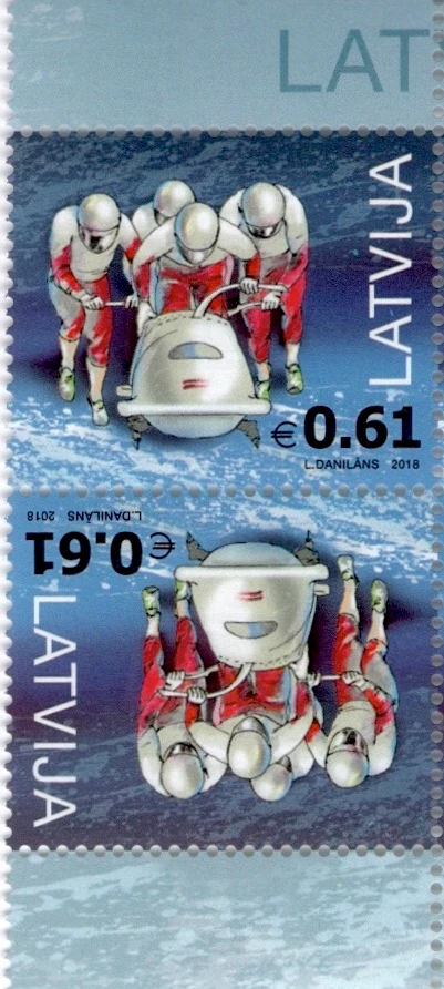 An amazing vertical Tete Beche pair depicting the Latvian bobsled team!